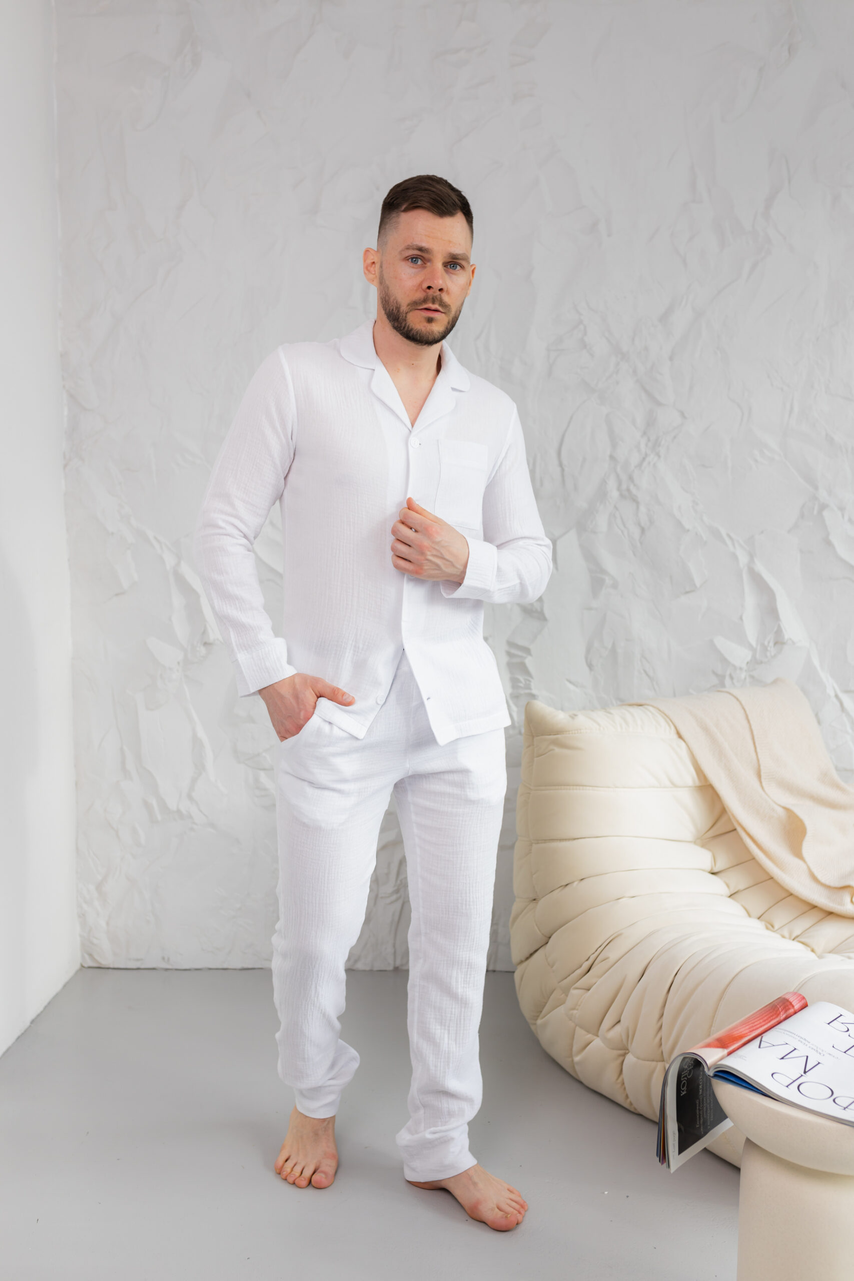 Ця біла піжама від BO.Brand – це не просто одяг для сну, а справжня інвестиція у власний комфорт. Дозвольте собі насолоджуватися моментами релаксу у вишуканому стилі з цією неймовірною чоловічою піжамою з мусліну.