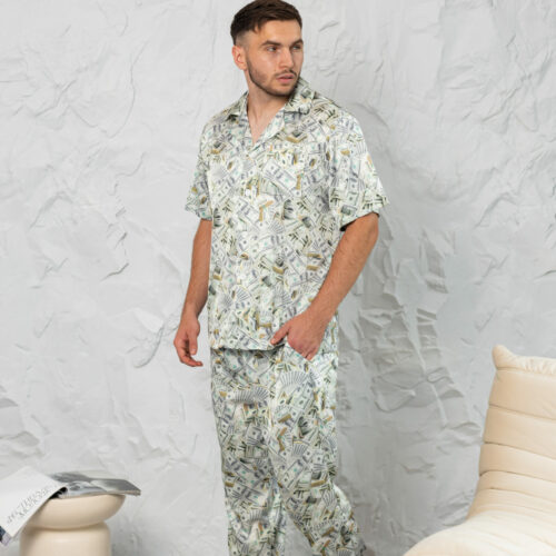 Виготовлена з високоякісного котону, піжама надзвичайно приємна на дотик та дозволяє шкірі вільно дихати протягом ночі. Дизайн унікальний, з делікатною обробкою та акцентом на деталях. Горловина сорочки має стильний комір-стійку, що додає шарму цьому комплекту. Штани зручні та практичні завдяки поясу з еластичною гумкою, який не стягує і не обмежує рухи.