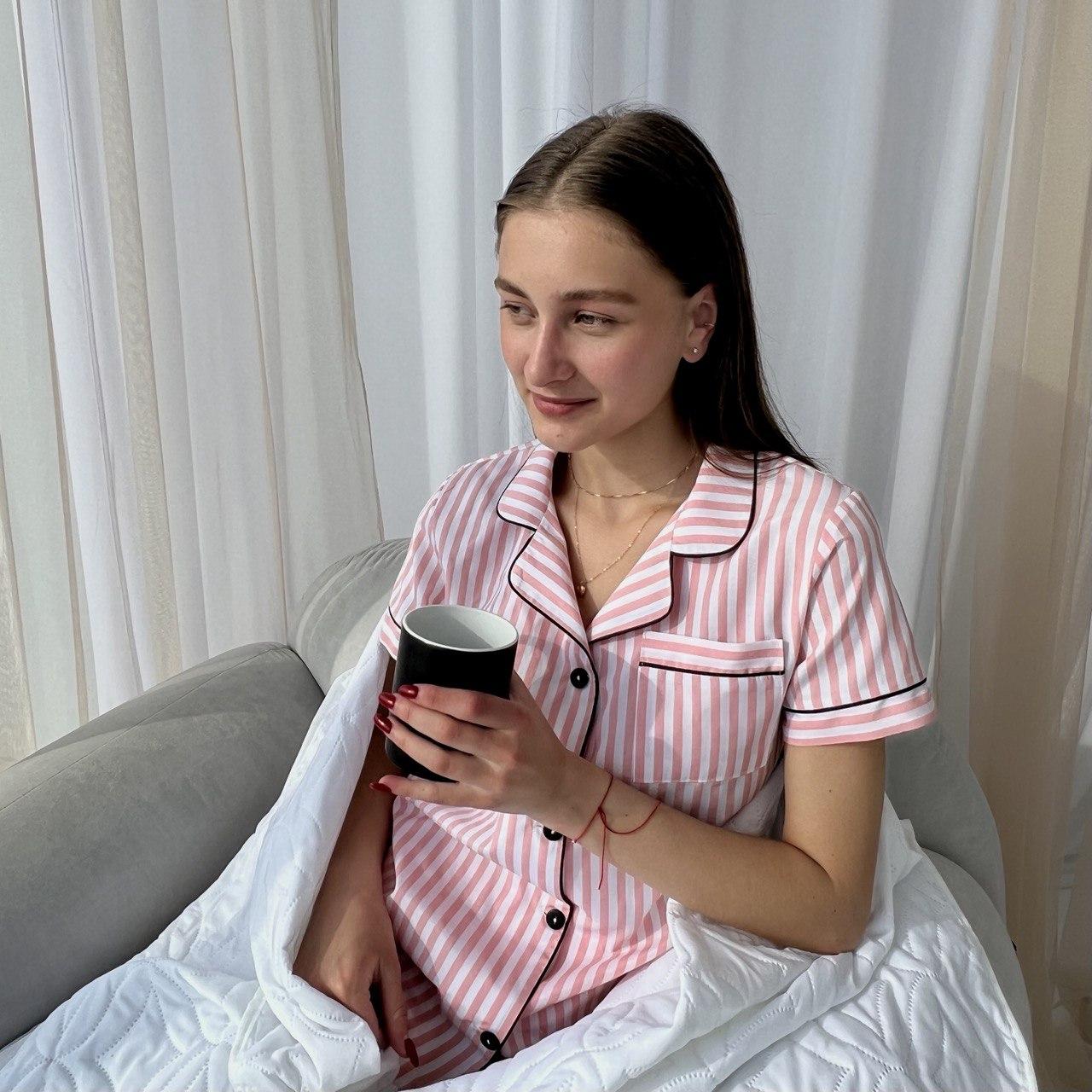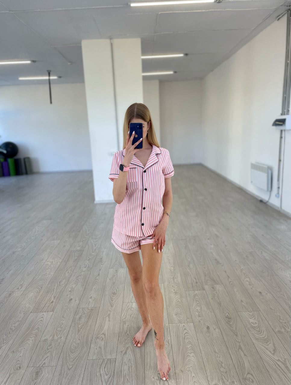 Ця піжама відрізняється вишуканим дизайном у рожевій смужці, яка надає їй ніжності та жіночності. Вона створена з найвищою увагою до деталей, щоб забезпечити вам найкращу якість і комфорт. М’який і дихаючий котон ніжно обгортає ваше тіло, даруючи вам приємні відчуття на шкірі.