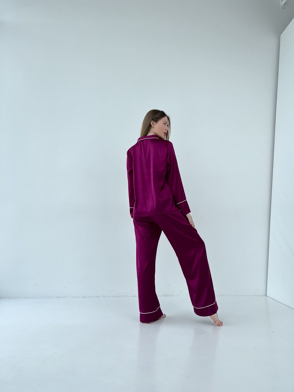 Виготовлена з високоякісної тканини, ця піжама вражає м’якістю та ніжністю при контакті зі шкірою, створюючи неймовірний комфорт. Сорочка має чудовий крій та невеликий виріз, що додає жіночності та делікатності до вашого образу. Довгі рукави надають тепла в холодну пору року, а вільні штани забезпечують вільність рухів, не обмежуючи вашої свободи.