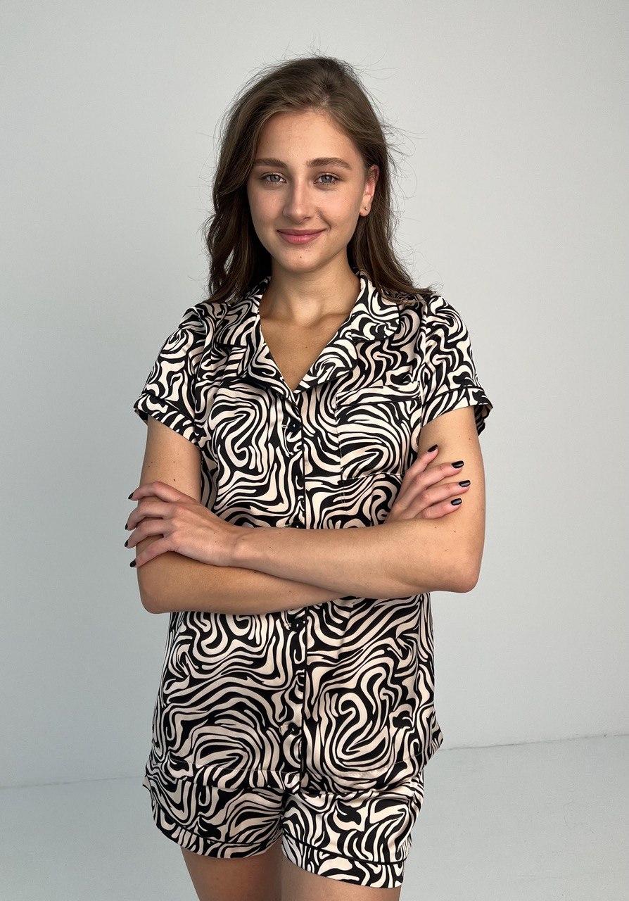 Сорочка з вишуканим малюнком зебри надає цій піжамі ніжності та жіночності. А її вільний крій забезпечує відмінну вентиляцію та зручність під час нічного сну. Шорти з тим самим малюнком завершують цей чудовий образ та забезпечують відмінну посадку завдяки еластичному поясу.