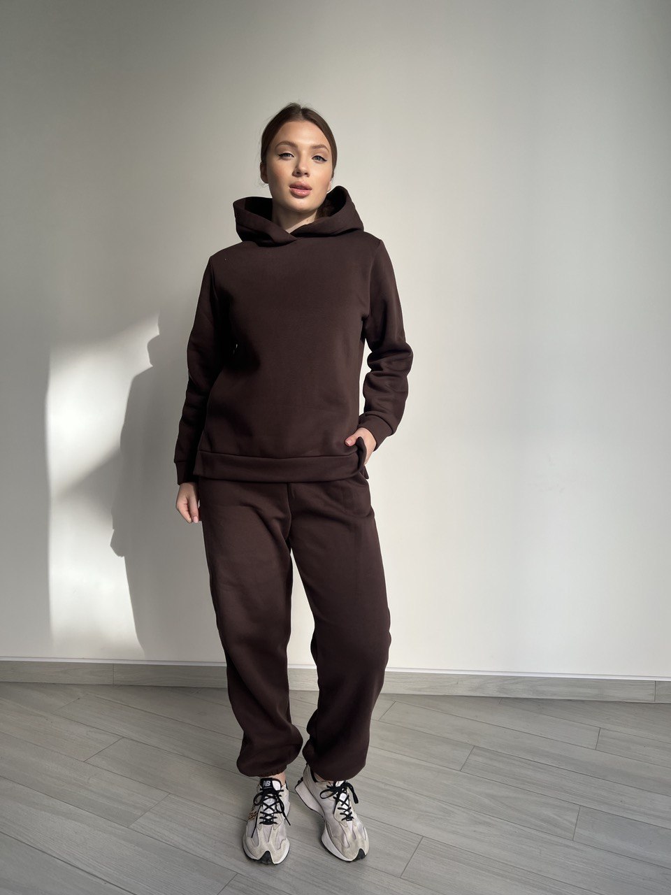 Наш спортивний костюм виготовлений з високоякісного флісу, який надає вам неймовірну теплоту та комфорт під час прохолодних днів. Коричневий колір додає образу природної краси та класичного шарму, роблячи його відмінним вибором для будь-якого сезону.